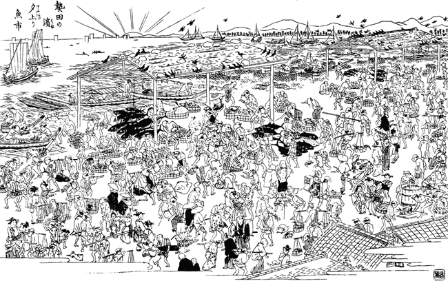 魚がたくさん取れる伊勢湾(いせわん)の海岸にあった熱田には、漁師(りょうし)もたくさん住み、すでに戦国時代には魚などを売る市(いち)ができていました。名古屋の町ができると、今の木之免町(きのめちょう)、大瀬子町(おおせこちょう)のあたりに魚市場ができ、毎日、朝と夕方の2回、たくさんの魚や貝、海草などが売買され、名古屋へと運ばれました。