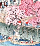 堀川は花見の名所として親しまれていました。 文化元年(1804)に、御普請奉行(ごふしんぶぎょう 工事をする役)の堀弥九郎(ほりやくろう)という人が、日置橋(ひおきばし)の南北の両岸、数百メートルに桃(もも)と桜の木を植えました。文政5年(1822)ころになると、大きく育った木はみごとな花をさかせ、たくさんの人がお花見に集まるようになりました。
