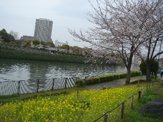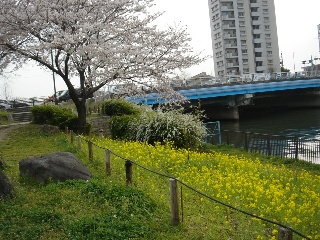 昨年末に白鳥橋北側の土手に植えた菜の花が桜と一緒にきれいに咲いております。