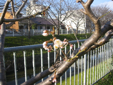 今日の暖かさで御用水跡街園の桜の花が咲いてきました。