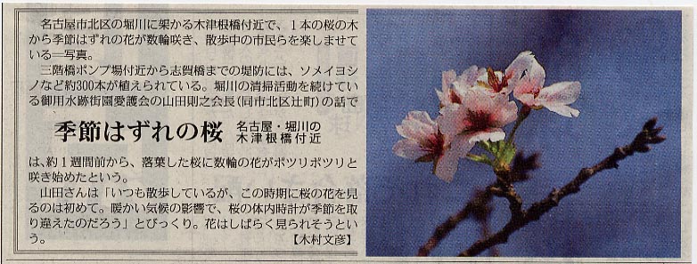 堀川上流 木津根橋付近に 季節はずれの桜さく
