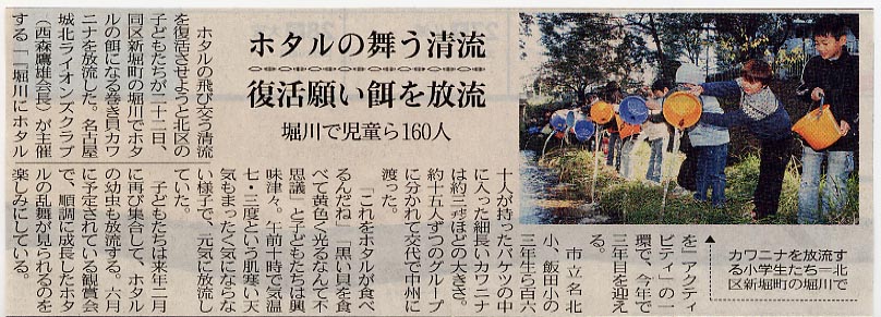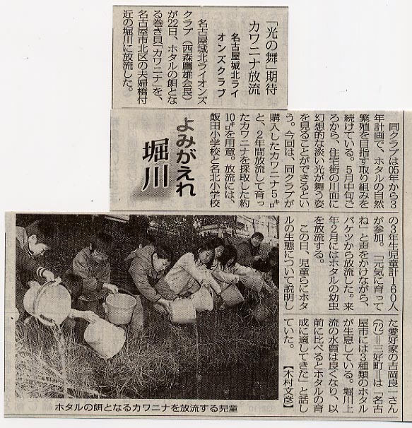 ホタルの舞う清流復活願い エサを放流