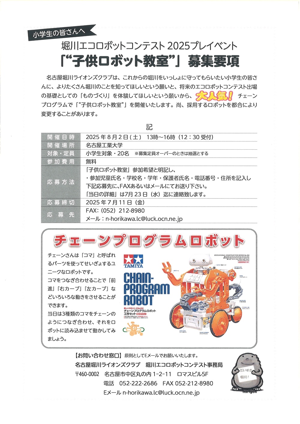このロボット教室は、8月24日(日)に開催する、第19回堀川エコロボットコンテスト2025の