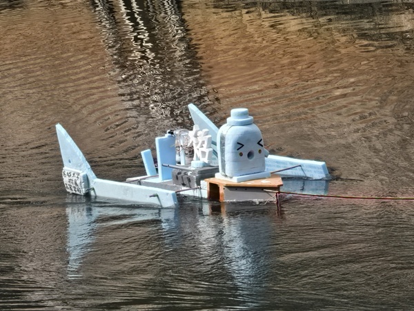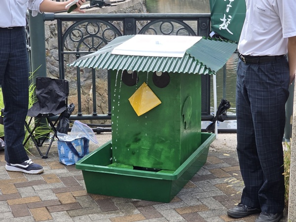 河童のお皿を潤しながら、堀川の水をろ過する河童型ロボット。