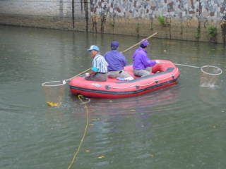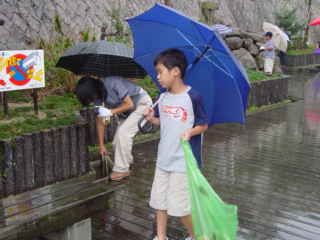 黒川水面に浮かぶごみをたもですくって清掃する、という場面もありました。