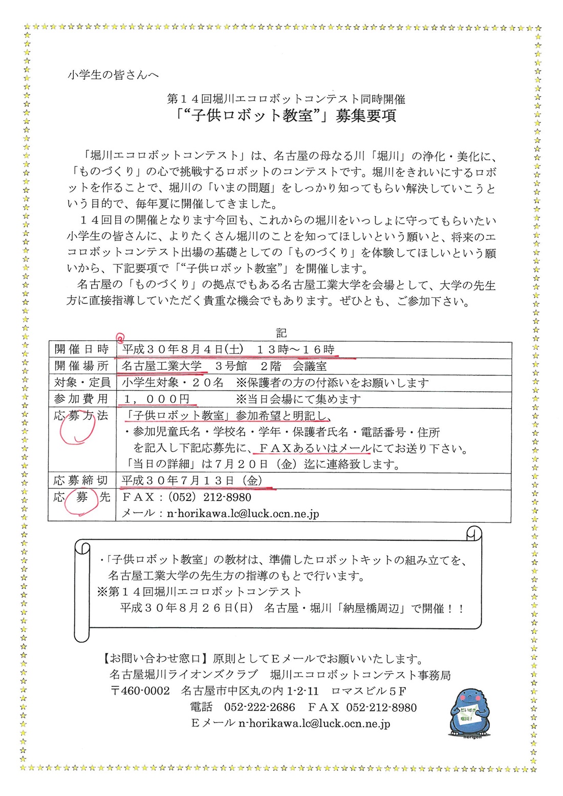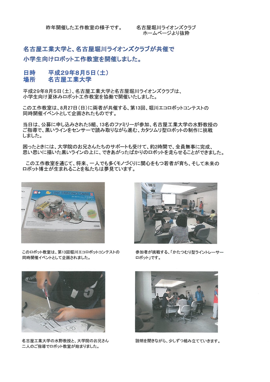 名古屋工業大学と、名古屋堀川ライオンズクラブは、今年も、堀川エコロボットコンテストの関連イベントとして
