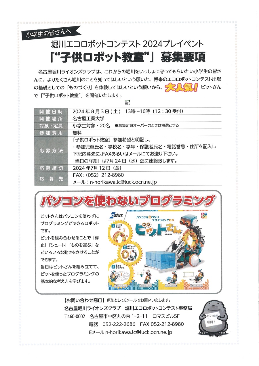 このロボット教室は、8月25日(日)に開催する、第18回堀川エコロボットコンテスト2024の