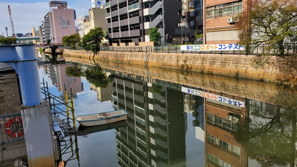 太陽光で電気を発電し、堀川の水をろ過する。