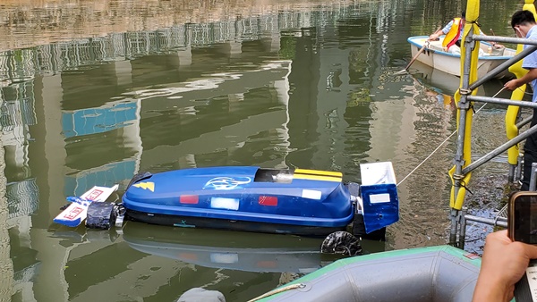 水中の汚れた水やごみを吸い込み、ろ過装置を通して循環するロボット。