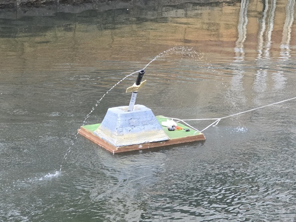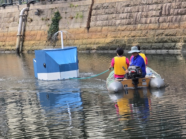 河童のお皿を潤しながら、堀川の水をろ過する河童型ロボット。