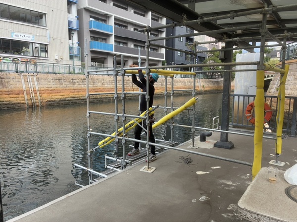 ロボットを安全に水面におろす足場も、前日にしっかり準備しました。