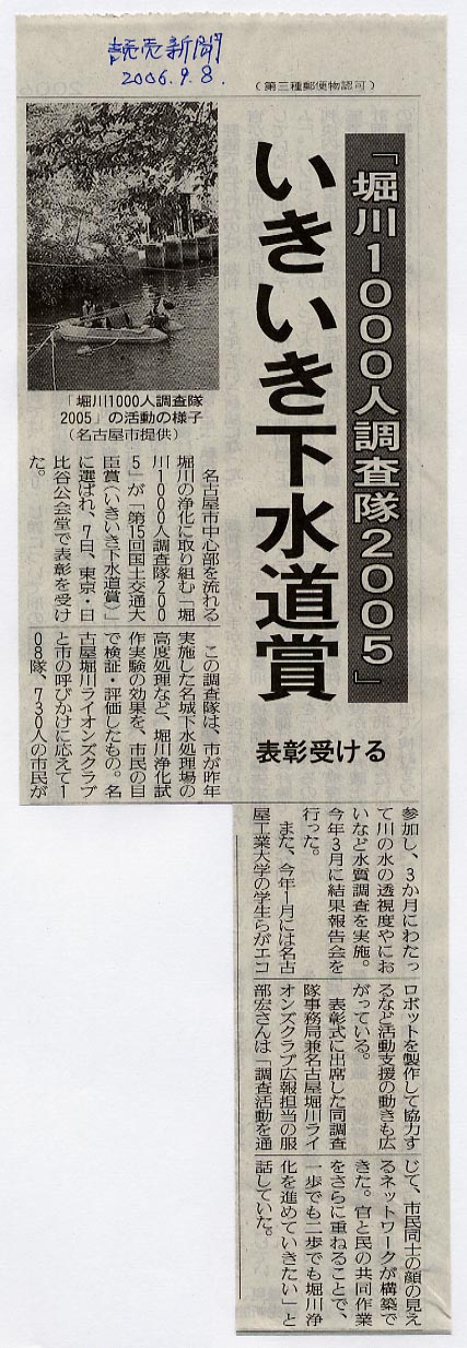 「堀川1000人調査隊2005」の取り組みに対して、このほど